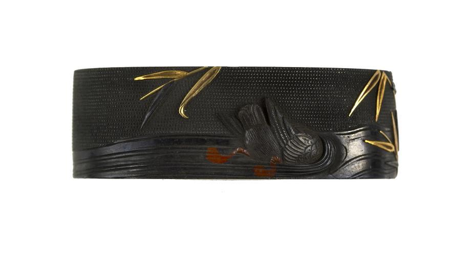 Keywords: Ishiguro Masatsune II - Fuchi with Diving Duck - Walters 511112.jpg The lower half of a duck is shown as it dived below the surface of the water Reeds overhang the top of the composition This is part of a set with Walters 51 1113 ca 1800 1850 late Edo shakudo gold cm 3 7 l accession number 51 1112 547 William T / Henry Walters Collection Baltimore date and mode of acquisition unknown Walters Art Museum Henry Walters Acquired by William T or Henry Walters Signature Ishiguro Masamori kao place of origin Edo present-day Tokyo Japan Walters Art Museum license Fuchi in the Walters Art Museum Ishiguro Masatsune II Media contributed by the Walters Art Museum needs category review |
