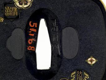 | Keywords: Ishiguro Masayoshi I - Tsuba with Paulownia Crests and Seals - Walters 51168 - Mark A.jpg  This tsuba is a collaboration between two artists The metalwork was done by Masayoshi and the enamel work was executed by a member of the Hirata school of cloisonné artists Across both sides of the tsuba various seals and flower crests are interspersed with Taoist symbols On the front the flower crests are paulownia Versions of the paulownia crest were used by the Imperial family and high-ranking warrior families On the reverse the crests are cherry blossoms The edge of the tsuba is gilded in gold between 1774 1853 late Edo shakudo gold enamels cm 8 1 7 47 0 5 accession number 51 168 7074 Henry Walters Baltimore date and mode of acquisition unknown Walters Art Museum Henry Walters Acquired by Henry Walters Signature Shippo/Hirata saku; Translation The seven treasures/made by Hirata; Signature Juo The Taste of Maryland Art Collecting in Maryland 1800-1934 The Walters Art Gallery Baltimore 1984 Japanese Cloisonne Enamels Fisher Collection The Walters Art Gallery Baltimore 1989-1990 place of origin Edo present-day Tokyo Japan Walters Art Museum license Tsuba in the Walters Art Museum Ishiguro Masayoshi I Media contributed by the Walters Art Museum needs category review Media contributed by the Walters Art Museum needs artist review |