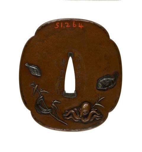 Keywords: Ishiguro Masayoshi I - Tsuba with Fish - Walters 51264 - Back.jpg Nine different forms of fish and sea creatures are illustrated on this tsuba All are regularly consumed as part of the Japanese diet On the front a spiny lobster is at the lower right Proceeding around in a clockwise direction are a flounder a puffer fish a second flounder and a sea bream On the reverse are a snapper an octopus an eel and a flounder 1843 Edo copper silver gold mother-of-pearl shakudo shibuichi cm 8 4 7 69 0 48 accession number 51 264 24729 Henry Walters Baltimore date and mode of acquisition unknown Walters Art Museum Henry Walters Acquired by Henry Walters Date Konen roku ju kyusai/Juo Masayoshi; Signature Konen roku ju kyusai/Juo Masayoshi; Translation 69 years old/Juo Masayoshi place of origin Edo present-day Tokyo Japan Walters Art Museum license Tsuba in the Walters Art Museum Ishiguro Masayoshi I Media contributed by the Walters Art Museum needs category review |