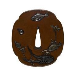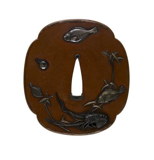Keywords: Ishiguro Masayoshi I - Tsuba with Fish - Walters 51264.jpg Nine different forms of fish and sea creatures are illustrated on this tsuba All are regularly consumed as part of the Japanese diet On the front a spiny lobster is at the lower right Proceeding around in a clockwise direction are a flounder a puffer fish a second flounder and a sea bream On the reverse are a snapper an octopus an eel and a flounder 1843 Edo copper silver gold mother-of-pearl shakudo shibuichi cm 8 4 7 69 0 48 accession number 51 264 24729 Henry Walters Baltimore date and mode of acquisition unknown Walters Art Museum Henry Walters Acquired by Henry Walters Date Konen roku ju kyusai/Juo Masayoshi; Signature Konen roku ju kyusai/Juo Masayoshi; Translation 69 years old/Juo Masayoshi place of origin Edo present-day Tokyo Japan Walters Art Museum license Tsuba in the Walters Art Museum Ishiguro Masayoshi I Media contributed by the Walters Art Museum needs category review |