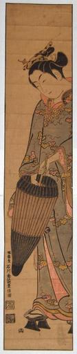 Keywords: Ishikawa Toyonobu - Woman with umbrella, rain cape and geta.jpg en A young woman with an umbrella She wears a rain-cape and high clogs geta Wide hashira-e 27 5 x 5 5 in ; 70 x 14 cms Coloured by hand with beni overlaid with urushi yellow mustard brown and blue Published c 1742 by Urokogata-ya http //www japaneseprints-london com/images/HPIM0568 jpg Ishikawa Toyonobu 1711-1785 Ishikawa Toyonobu Umbrellas in art Capes vestment in art Geta footwear Ukiyo-e of beautiful women Woodblock prints of the Edo period Hashira-e PD-Art-100 |