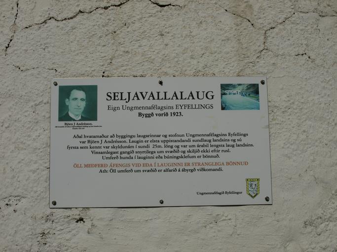| Keywords: Isl Seljavallalaug uppls.JPG en Information board by Seljavallalaug the oldest swimming pool in Iceland in south Iceland close to Skógar is Upplýsingaskilti við Seljavallalaug elstu sundlaug Íslands á Suðurlandi skammt frá Skógum Own Jabbi 9 8 2008 ImageNote 1 556 816 364 336 3200 2400 2 Björn J Andrésson ImageNoteEnd 1 ImageNote 2 1000 860 1040 120 3200 2400 2 Seljavallalaug ImageNoteEnd 2 ImageNote 3 464 732 2112 1240 3200 2400 2 A sign on the changing room next to Seljavallalaug ImageNoteEnd 3 Seljavallalaug Signs in Iceland Files by user Jabbi Information boards in Iceland |