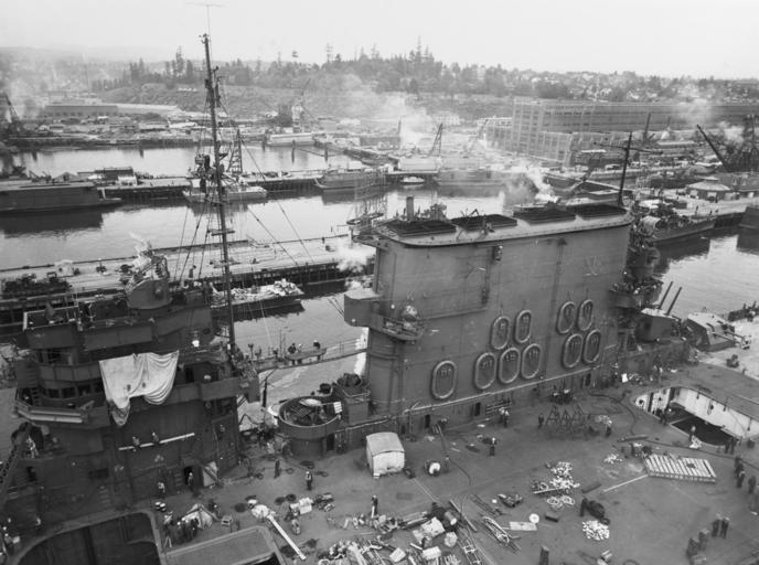 Keywords: Island of USS Saratoga (CV-3) on 14 May 1942.jpg View of the island of the U S Navy aircraft carrier USS Saratoga CV-3 taken at the Puget Sound Navy Yard Washington USA 14 May 1942 Note the newly installed Mark 37 gun directors CXAM radar was installed on the forward end of the stack SC-1 on the aft end <br> Note the battleship in the right background which is most probably USS Nevada BB-38 Official U S Navy photo http //www history navy mil/our-collections/photography/numerical-list-of-images/nhhc-series/nh-series/19-N-29000/19-N-29682 html 19-N-29682 from the U S Navy http //www history navy mil Naval History and Heritage Command 1942-05-14 U S Navy PD-USGov-Military-Navy Aboard USS Saratoga CV-3 USS Nevada BB-36 Puget Sound Naval Shipyard in the 1940s Pacific War in May 1942 |