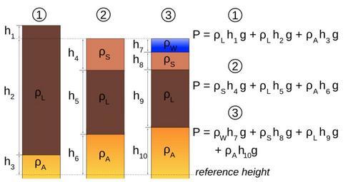 | Keywords: Isostatic equilibrium EN.svg en Schematic representation of the principle of isostatic equilibrium in geodynamics The three situations in the figure are 1 a mountain range or plateau; 2 a totally filled basin surface is at sea level ; 3 an underfilled basin with sea water forming the top part of the column The formulas to the right give the lithostatic pressure at reference height Symbols used ρ<sub>L</sub> density of the lithosphere; ρ<sub>A</sub> density of the asthenosphere; ρ<sub>S</sub> density of the sediments in the basin; ρ<sub>W</sub> density of sea water The heights of different sections of the columns are represented by a letter h; while g is the gravitational acceleration In the case of isostatic equilibrium the lithostatic pressure should be equal for all three cases at the reference height in formula P<sub>1</sub> P<sub>2</sub> P<sub>3</sub> own Woudloper 2009-04 Dutch language version <gallery><center> File Isostatic equilibrium NL svg </gallery></center> Isostasy Lithospheres Geophysical diagrams |