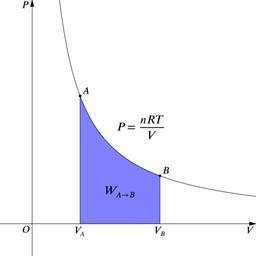| Keywords: Isothermal process.svg en Illustration of isothermal process 2011-06-20 own Netheril96 Created by Asymptote and converted by Inkscape Source file <pre> size 300 ; settings tex xelatex ; usepackage amsmath unicode-math ; texpreamble \setmathfont XITS Math ; import graph; xaxis V -50 450 Arrow ; yaxis P -50 350 Arrow ; label O 0 0 SW ; real f real x return 15000/x; ; guide g graph f f 350 350 operator ; label scale 1 2 Label P \dfrac T V g align 2 2 ; draw g ; pair A f 200 200 ;pair B 200 f 200 ; pair C 200 0 ;pair D f 200 0 ; filldraw graph f f 200 200 operator --C--D--cycle lightblue ; dot A ;dot B ; label A A NE ;label B B NE ; label V_B C S ;label V_A D S ; label scale 1 2 Label W_ A\to B 200+f 200 /2 50 ; </pre> cc-zero Uploaded with UploadWizard Isothermal process |