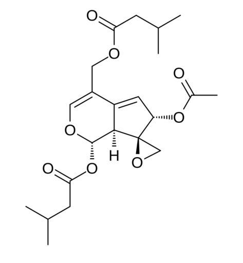 Keywords: Isovaltrate.svg Chemical structure of isovaltrate Own 18 12 29 January 2014 UTC Ed Edgar181 Iridoids Acetate esters Isobutyrate esters Epoxides