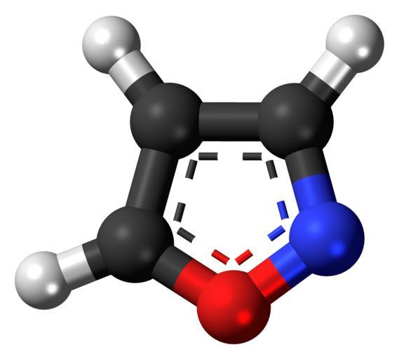| Keywords: Isoxazole-3D-balls.png Ball-and-stick model of the isoxazole molecule a nitrogen-oxygen heterocycle and a simple aromatic ring Colour code 505050 Carbon C black<br> F0F0F0 Hydrogen H white<br> F51E1E Oxygen O red<br> 3C50FA Nitrogen N blue<br> 2011-02-12 own DS Visualizer Jynto talk Space-filling version cc-zero Isoxazole Images by Jynto Ball-and-stick models |