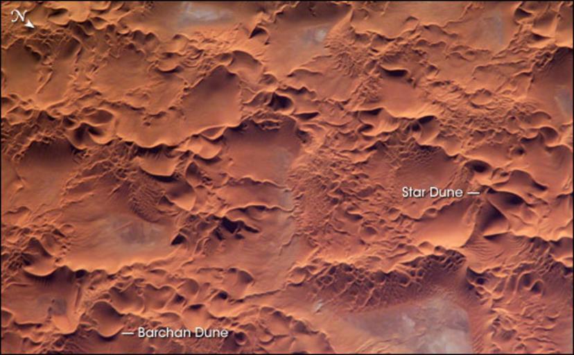 | Keywords: Issaouane Erg, Algeria.jpg en The Issaouane Erg sand sea is located in eastern Algeria between the Tinrhert Plateau to the north and the Fadnoun Plateau to the south Ergs are vast areas of moving sand with little to no vegetation cover Considered to be part of the Sahara Desert the Issaouane Erg covers an area of approximately 38 000 km2 These complex dunes form the active southwestern border of the sand sea The most common landforms in the image are star dunes and barchan or crescent dunes Small linear dunes appear at top left Star dunes are formed when sand is transported from variable wind directions whereas barchan dunes form in a single dominant wind regime The superimposition of two dune types suggests that wind regimes have changed through time The active nature of this portion of the Erg is well illustrated by this image ”smaller dunes form and migrate along the flanks of the larger dunes and sand ridges Occasional precipitation fills basins formed by the dunes; as the water evaporates salt deposits are left behind which appear as bluish-white areas 2012-01-28 http //visibleearth nasa gov/view_rec php id 17085 Astronaut photograph was acquired January 16 2005 with a Kodak 760C digital camera with an 800 mm lens and is provided by the ISS Crew Earth Observations experiment and the Image Science Analysis Group Johnson Space Center The supports the laboratory to help astronauts take pictures of Earth that will be of the greatest value to scientists and the public and to make those images freely available on the Internet Additional images taken by astronauts and cosmonauts can be viewed at the NASA/JSC Custom license marker 2012 01 28 Uploaded with UploadWizard Satellite pictures of Algeria Touat Star dunes Barchan Erg Issaouane Depositional landforms in Algeria |