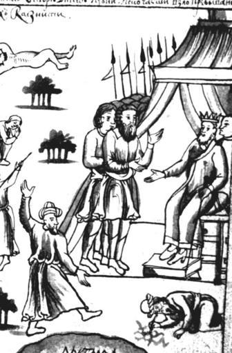 | Keywords: IstSib022 2.jpg  Ца ь Кучум  ассп ашивает волхвов и  усских пленников о видении Исто ия Сиби ская  ультимедиа Цент  ГУ http //www mmedia nsu ru/vbook/vbook/obj8/MINIATURES htm 1697 - 1703 С У Ремезов Author died more than 70 years ago - public domain PD-old Remezov Chronicle |