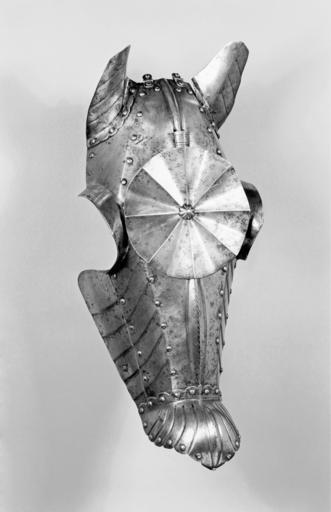 | Keywords: Italian - Chamfron - Walters 511368.jpg Horses also needed protection from the enemy's weapons By the mid-1400s armorers had devised a near-complete set of armor to protect the steed in battle Together these formed a bard The head was covered by a shaffron from chanfrein French for the part of a horse's head from the ears to the nostrils Attached side plates covered the horse's cheeks The neck was covered by a crinet the sides by flanchards and the hindquarters by a crupper The peytral covered the front of the horse's chest and sides around to the saddle The legs were left free for easy movement between 1500 1550 steel iron leather copper alloy in modern restored areas cm 56 25 2 25 accession number 51 1368 34572 Baron de Cosson Sir Edward Barry bart Ockswell Manor date and mode of acquisition unknown Barry Sale Sotheby London July 5 1965 lot 32 Walters Art Museum 1965 by purchase Museum purchase with funds provided by the S A P Fund 1965 World of Wonder The Walters Art Gallery Baltimore 1971-1972 place of origin Italy Walters Art Museum license Baroque art in the Walters Art Museum Armour in the Walters Art Museum Armour of Italy Italian art in the Walters Art Museum Shaffron |
