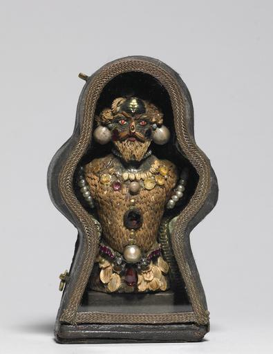 Keywords: Italian - Curiosity Figure (Seed Man) - Walters 7526.jpg This is a rare example of a kind of bizarre composite figure that achieved popularity around 1600 especially in Milan The most famous exponent was Guiseppe Arcimboldo 1527-1593 whose painted portraits combining carefully observed natural elements were at once intriguing inventions and serious allegories for example his Portrait of Emperor Rudolf II as Vertumnus Lord of the Seasons in which he flatters the emperor by suggesting that imperial power encompasses nature itself Made of materials ranging from seeds to a beetle abdomen to pearls around a wax core this curious figure exemplifies the notion of human beings as encompassing all the virtues and frailties of the physical world The 1598 inventory of the collection of the duke of Bavaria included a small Mexican idol decorated with seeds and nuts This is lost but may have inspired this type of figure Due to his fragility the figure stays in his original case ca 1600 flax and other seeds shell wood wax beetle case and parts pearl ruby amethyst; wood leather silk velvet metallic thread and glass case cm 8 3 accession number 75 26 11531 Nicholas Landau Paris date and mode of acquisition unknown Walters Art Museum 1970 by purchase Museum purchase 1970 World of Wonder The Walters Art Gallery Baltimore 1971-1972 place of origin Germany Walters Art Museum license Baroque art in the Walters Art Museum Italian art in the Walters Art Museum Media contributed by the Walters Art Museum needs category review