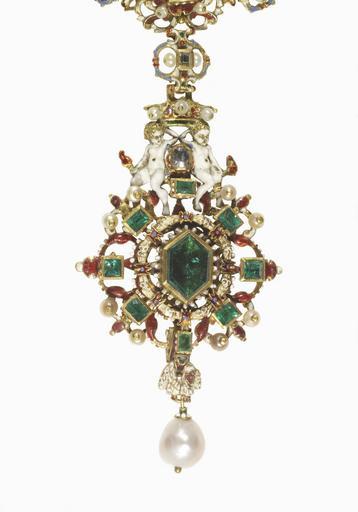 | Keywords: Italian - Jeweled Collar - Walters 44508 - Detail.jpg This splendid piece of jewelry which we would call a necklace could have been worn without or with a pendant around the neck or in the case of a woman the waist The pendant might be a large mounted jewel or an insignia of office or an order In the 19th or early 20th century the collar was repaired Apparently at that time someone added to the bottom of the pendant a tiny enameled figure of a white sheep-symbol of the great Habsburg military Order of the Golden Fleece This presumably added to the collar's value by introducing an exclusive historical association An American buyer would not have known that the presentation of the historical elements is incorrect ca 1550 1600 Renaissance gold enamel emeralds diamonds cm 73 3 accession number 44 508 9606 Henry Walters Baltimore date and mode of acquisition unknown Walters Art Museum Henry Walters Acquired by Henry Walters World of Wonder The Walters Art Gallery Baltimore 1971-1972 Jewelry - Ancient to Modern The Walters Art Gallery Baltimore 1979-1980 Objects of Adornment Five Thousand Years of Jewelry from the Walters Art Gallery Baltimore Cooper-Hewitt National Design Museum New York; Chrysler Museum of Art Norfolk; Carnegie Museum of Art Pittsburgh; San Antonio Museum of Art San Antonio; Philbrook Museum of Art Tulsa; Honolulu Academy of Arts Honolulu; New Orleans Museum of Art New Orleans; Milwaukee Art Museum Milwaukee; Minneapolis Institute of Arts Minneapolis; Toledo Museum of Art Toledo; The John and Mable Ringling Museum of Art Sarasota 1984-1987 Jewelry from the Walters Art Museum and the Zucker Family Collection The Walters Art Gallery Baltimore 1987 place of origin Italy Walters Art Museum license Renaissance applied arts in the Walters Art Museum Jewellery in the Walters Art Museum Italian art in the Walters Art Museum Media contributed by the Walters Art Museum needs category review Media contributed by the Walters Art Museum needs artist review Badges of the Order of the Golden Fleece |