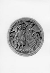 Keywords: Italian - Mirror Case with Two Lovers - Walters 71107.jpg This mirror cover of unusual quality shows a young man offering his lady a flower The figures stand on a patch of carefully rendered turf between two trees against a crosshatched background The man wears a houppelande with large dagged-edged sleeves and a big cloth cap or chaperon The lady's gown also has pendant sleeves with elaborate facings; she wears a bourrelet on her head A band of roping surrounds the scene and two holes for attachment are visible When in the 18th century the cover and its mate were drawn by Jan Ivan Gravenbroeck for the catalogue of the collection of Pietro di Giacomo Gradenigo in Venice its corner leaf projections now lost were still intact Above the young man's head is inscribed the work PRENES the first word of a motto which is completed on the pendant mirror case in the Louvre depicting a similar couple Here the inscription reads EN GRE Taken together the two parts of the motto may be translated Take kindly The full phrase is found in a stanza of Christine de Pisan's poetry Prenez en gre le don de votre amant Take kindly the gift of your lover Because the motto was used in France and Burgundy the ivory has often been called French Flemish or Burgundian However all of the features of this example including the particular balance of the landscape elements and the figures are found more frequently in works from north Italy The crisp carving and stylized postures of the figures relate to works attributed to Milan and Lombardy where significantly the language like the motto was French The attitude of the figures facing each other in profile is that of the conventional Italian wedding portrayal of the 15th century The strict profile confrontation contrasts strongly with the interaction of the two figures in similar scenes on French mirror cases ca 1410 early Renaissance ivory D 5/16 x Diam 3 1/4 in 0 85 x 8 21 cm accession number 71 107 10459 Pietro di Giacomo Gradenigo Venice ca 1750 by purchase Jacques Seligmann Paris date of acquisition unknown by purchase Henry Walters city Baltimore Walters Art Museum Henry Walters Acquired by Henry Walters 1914 Transcription above the young man's head PRENES The International Style The Arts in Europe Around 1400 The Walters Art Gallery Baltimore 1962 The Medieval Garden Spencer Museum of Art Lawrence; Dumbarton Oaks Washington 1983 The Taste of Maryland Art Collecting in Maryland 1800-1934 The Walters Art Gallery Baltimore 1984 Medieval Games of Love and War The Walters Art Gallery Baltimore 1995-1996 Images in Ivory Precious Objects of the Gothic Age The Detroit Institute of Arts Detroit; The Walters Art Gallery Baltimore 1997 place of origin Milan Italy Walters Art Museum license Renaissance applied arts in the Walters Art Museum Italian carved ivory mirror cases in the Walters Art Museum 15th-century carved ivory mirror cases Couples in love in art Media contributed by the Walters Art Museum needs category review |