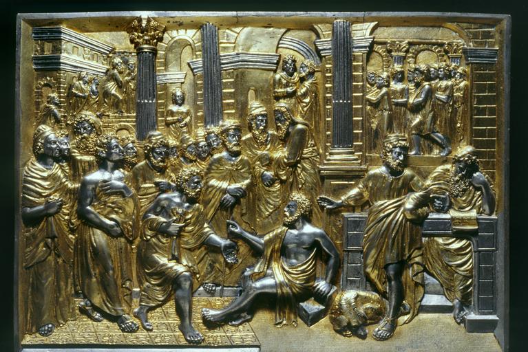| Keywords: Italian - Plaque with Saints Peter and John Healing the Lame Man - Walters 571054.jpg In the Acts of the Apostles a lame man was begging outside the Temple of Jerusalem Seeing Peter and John he asked them for money but instead they healed him The Jews can be recognized by their covered heads The gate where the blind man was begging was called The Beautiful and the unknown artist depicted it as a splendid structure with fluted Corinthian columns The plaque was probably set into a chest or casket ca 1520 1580 Renaissance gilt silver cm 15 21 5 accession number 57 1054 38220 Henry Walters Baltimore date and mode of acquisition unknown Walters Art Museum Henry Walters Acquired by Henry Walters place of origin Italy Walters Art Museum license Renaissance reliefs in the Walters Art Museum Plaquettes Italian art in the Walters Art Museum Media contributed by the Walters Art Museum needs category review St Peter Healing the Crippled Beggar |