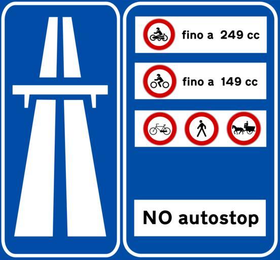 | Keywords: Italian traffic signs - Inizio strada extraurbana principale.svg Sign of beginning speedway in Italy Kiirtee alguse liiklusmärk Itaalias segnale di preavviso di inizio strada extraurbana principale Own 2010-06-23 Gigillo83 Diagrams of indication signs useful for driving of Italy Prohibitory road signs Controlled-access highway signs Italian language signs Blue signs Rectangular road signs | ||||