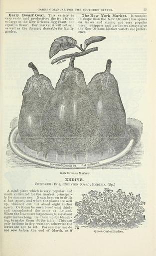 Keywords: J. Steckler Seed Co., Ltd. garden manual 1900 (16547011796).jpg GARDEN MANUAL FOR THE SOUTHERN STATES <br> <br> Early Dwarf Oval This variety is <br> very early and productive; the fruit is not <br> so large as the New Orleans Egg Plant but <br> equal in flavor For market it will not sell <br> as well as the former; desirable for family <br> garden <br> The New York Market Is rounder <br> in shape than the New Orleans; has spines <br> on leaves and stems; not very popular <br> here Shippers and gardeners always give <br> the New Orleans Market variety the prefer- <br> ence <br> -rr- l ; -; 'i'; <br> New Orleans Market <br> ENDIVE <br> Chicoree Fr Endivien Gen Endibia Sp <br> A salad plant which is very popular and <br> much cultivated for the market principal- <br> ly for summer use It can be sown in drills <br> a foot apart aud when the plants are well <br> up thinned out till about eight inches <br> apart Or it can be sown broad-cast thinly <br> and transplanted the same as Lettuce <br> When the leaves are largeenough say about <br> eight inches long tie them up for blanch- <br> ing to make them fit for table This can <br> only be done in dry weather otherwise the <br> leaves are apt to rot For summer use do <br> not sow before the end of March as if <br> <br> Green Curled Endive 43933558 150250 78709 Page 57 Text http //www biodiversitylibrary org/page/43933558 1900 10 5962/bhl title 78709 Henry G Gilbert Nursery and Seed Trade Catalog Collection ; J Steckler Seed Co Biodiversity Heritage Library J Steckler Seed Co Ltd garden manual 1900 dealers in vegetable flower field and grass seeds Garden Stories Catalogs J Steckler Seed Co Seed industry and trade Seeds Trade catalogs Vegetables U S Department of Agriculture National Agricultural Library bhl page 43933558 dc identifier http //biodiversitylibrary org/page/43933558 bhlGardenStories Eggplant BHLinbloom j steckler seed co u s department of agriculture national agricultural library bhlgardenstories bhlinbloom Information field Flickr posted date ISOdate 2015-02-18 CC-BY-2 0 BioDivLibrary https //flickr com/photos/61021753 N02/16547011796 2015-08-24 02 50 18 cc-by-2 0 PD-old-70-1923 Eggplant J Steckler Seed Co Ltd garden manual 1900 Photos uploaded from Flickr by Fæ using a script |