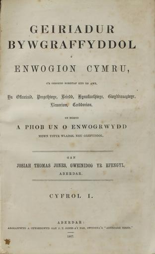 | Keywords: J. T. Jones - Enwogion Cymru (teitl cyf. I).JPG  en Title page of Volume I of Geiriadur Bywgraffyddol o Enwogion Cymru Aberdare 2 volumes 1867 a Welsh-language biographical dictionary of eminent Welsh people compiled by Josiah Thomas Jones cy Wynebddalen Cyfrol I Geiriadur Bywgraffyddol Enwogion Cymru Aberdar 2 gyfrol 1867 bywgraffiadur am Gymry enwog a ysgrifenwyd gan Josiah Thomas Jones Enwogion Cymru vol I 1867 Josiah Thomas Jones; photograph taken by myself 1867 PD-old 1867 books 1867 in Wales Books from Wales Biographies History of Wales Books in Welsh Title pages from the United Kingdom |