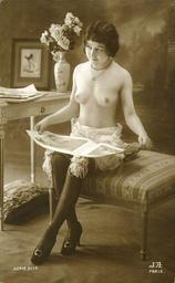 | Keywords: JA-Serie-0117 French postcard-number1.jpg en Early 20th-century French postcard labelled JA Serie 0117 with a woman posed in early twentieth century lingerie black stockings and a loose white slip which has slipped off the shoulders sitting and looking at some kind of art prints For related photos using the same stool/hassock see File JA-Serie-096_French_postcard-number1 jpg File JA-Serie-096_French_postcard-number2 jpg http //www edwardian-delights com/salesglp htm www edwardian-delights com between 1910 1917 Creator Jean Agélou PD by age <gallery>Image Agelou19 jpg</gallery> PD-old-auto-1923 1921 Jean Agélou Postcards of nude women in France Black and white photographs of topless women |