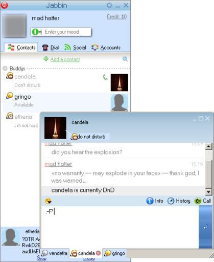 Keywords: Jabbin with Jabbin 3b.png en Screenshot of Jabbin 3 0 beta with open chat sessions showing contact list and chat window de Bildschirmphoto von Jabbin 3 0 beta mit offenen Chat-Sitzungen; Kontaktliste und Chat-Fenster sind angezeigt own Pangean 2011-03-03 free screenshot I've taken this screenshot myself The depicted Windows software runs on a l Ubuntu GNU/Linux system with LXDE via Wine with no proprietary fonts installed Cc-zero Jabbin Screenshots of free software |