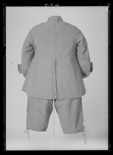 Keywords: Jacka av grå kamlott. Tillhört Karl X Gustav (1622-1660) - Livrustkammaren - 27044.tif Denna dräkt består av jacka byxor och kanoner av grå kamlott d'Hollande Materialet är gråbrun yllekamlott med en vådbredd av 77 cm utan stad 20x8 5 tr/cm2 Varpen består av 1ljus och 1 mörk tråd som tvinnats åt höger tillsammans och inslaget består av 3 ljusa otvinnade trådar Staden utgörs av enbart 2 vita trådar <br/><br/>Jackan som till sin form mycket påminner om jackan till dräkt nr 3419 är sydd av 4 storastycken som vidgats i sidorna och rundats i kanten Den har ca 37 cm öppna skört i sidornaoch bak Jackan har sytts ihop med korta sidosömmar och mitt bak endast till midjan Ärmarna består av 2 stycken och har öppna framsömmar Jackan är mitt fram 69 cm lång ståndkragen oräknad denna är 5 cm hög mitt fram och mitt bak 3 5 cm Mitt bak är jackan 73cm lång utan krage Den har sytts så att dess korta sidosömmar sömmen mitt bak ochaxelsömmarna sytts samman från baksidan <br/><br/>Ärmarna har sytts ihop så att överstyckena ligger ovanpå de undre i den utsvängda baksömmenoch ärmarna har sedan trätts genom ärmhålet Endast den lilla korta framsömmen 15 cmlång nedanför det ca 35 cm långa sprundet har sytts ihop från baksidan I baksömmen påärmen är den nedre - raka - delen ca 15 cm lång öppen för att kunna bilda uppslag och harhär försetts med en skoning av brun rips Jackan verkar ej ha haft något mellanfoder men iärmuppslagen sitter papper mellan fodret och tyget Detta utgör styvnad för denursprungliga fastsydda garneringen av silverspets ty täta hål efter stygn visar att mansytt genom pappret det har varit en ca 9 cm bred spetsbesättning Jackan är fodrad medsilvermoiré med en vådbredd av 49 cm utan stad 64x14 tr/cm2 Varp och inslag är av vittotvinnat silke I varje inslag ligger på rätan en silverlan Stad 0 7 cm 6 gröna 6 gula 6 gröna 6 gula 6 gröna trådar samt 1 tjock vit - ripsbindning Mitt i tyget syns en randefter vattringen <br/><br/>Jackans foder är skuret på samma sätt som tyget i övrigt dock har man omedelbart ovanförsidoskörtets öppning satt in 2 horisontella kilar för att göra plagget mindre åtstramande De är något varierande i storlek och placering men ca 1 cm långa Fram har jackan en helobruten rad av knapphål på vänster sida vilket ju icke är fallet med jackan nr 23 Det ärinalles 29 knapphål 3 5 cm långa och sydda med brunt högertvinnat silke över silkestråd 8stygn/cm På höger sida sitter utefter hela kanten 28 st d 2 cm knappar av vilka dockendast de 17 översta kunnat begagnas eftersom fodret täcker de följande På vänsterframstycke finns i sidokanten 15 knappar och på höger framstyckes sidokant 16 st svarandemot de 16 knapphål som sitter i sidostyckena och baksprundet Inte någon knapp i sprundenmitt bak eller i sidorna har kunnat knäppas ty fodret har hela vägen sytts över hålen Baktill finns på vänster stycke endast 13 knappar kvar På vänster ärms överstycke sitterav knappgarneringen endast 8 knappar kvar på höger ärm finns 14 knappar kvar Ärmarnasbakstycken har vardera 16 knapphål Ärmuppslagen har skoning av brun rips på kamlotten <br/><br/>Kragen som är försedd med styvnad av fiskben instoppade i oblekt linnelärft 19x18tr/cm2 i vertikala avsyningar på drygt ½ cm s avstånd har ursprungligen varit fodrad medljus taft på insidan Detta tyg saknas nu nästan helt I jackan sitter axelsömmarna 2 sthängslen av linnelärft 20x17 tr/cm2 klädda med gulvitt siden De är något kortare framåtän bakåt och har 3 tränsade hål i varje ända så att möjlighet att reglera byxorna längdföreligger Jackan är på ärmarna och längs sprunden översållad av trådrester av grått silke även något enstaka prov på blått silke som tyder på en ursprungligen fastsydd garneringrunt kanterna I 1675 och 1691 års inventarier anmärks också att spetsarna sprättats bort isamband med 1675 års kröning original caption decade 1650 woollen Färg grå d1 - dräkt - yttermaterial material ylle - silver d2 - dräkt - foder material silver LRK Karl X Gustav av Sverige Museum Tre Kronor / Ståthållarämbetet - STÄ tidigare Kungl Husgerådskammaren 1999-2013 Modelejon 2002 place of origin original filename LN_B10733_013613 58011 inventory number LRK 21476 27044 CC0 Jacka av grå kamlott Tillhört Karl X Gustav 1622-1660 - Livrustkammaren - 27044-negative tif <gallery caption Different images of same object > File Jacka av grå kamlott Tillhört Karl X Gustav 1622-1660 - Livrustkammaren - 1360 tif File Jacka av grå kamlott Tillhört Karl X Gustav 1622-1660 - Livrustkammaren - 18482 tif File Jacka av grå kamlott Tillhört Karl X Gustav 1622-1660 - Livrustkammaren - 9920 tif </gallery> Clothing Media contributed by LSH unmatched objKeyword Clothing in Livrustkammaren 1650s fashion Media contributed by LSH 2013-10 |