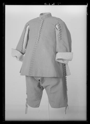 Keywords: Jacka av grå kamlott. Tillhört Karl X Gustav (1622-1660) - Livrustkammaren - 9920.tif Denna dräkt består av jacka byxor och kanoner av grå kamlott d'Hollande Materialet är gråbrun yllekamlott med en vådbredd av 77 cm utan stad 20x8 5 tr/cm2 Varpen består av 1ljus och 1 mörk tråd som tvinnats åt höger tillsammans och inslaget består av 3 ljusa otvinnade trådar Staden utgörs av enbart 2 vita trådar <br/><br/>Jackan som till sin form mycket påminner om jackan till dräkt nr 3419 är sydd av 4 storastycken som vidgats i sidorna och rundats i kanten Den har ca 37 cm öppna skört i sidornaoch bak Jackan har sytts ihop med korta sidosömmar och mitt bak endast till midjan Ärmarna består av 2 stycken och har öppna framsömmar Jackan är mitt fram 69 cm lång ståndkragen oräknad denna är 5 cm hög mitt fram och mitt bak 3 5 cm Mitt bak är jackan 73cm lång utan krage Den har sytts så att dess korta sidosömmar sömmen mitt bak ochaxelsömmarna sytts samman från baksidan <br/><br/>Ärmarna har sytts ihop så att överstyckena ligger ovanpå de undre i den utsvängda baksömmenoch ärmarna har sedan trätts genom ärmhålet Endast den lilla korta framsömmen 15 cmlång nedanför det ca 35 cm långa sprundet har sytts ihop från baksidan I baksömmen påärmen är den nedre - raka - delen ca 15 cm lång öppen för att kunna bilda uppslag och harhär försetts med en skoning av brun rips Jackan verkar ej ha haft något mellanfoder men iärmuppslagen sitter papper mellan fodret och tyget Detta utgör styvnad för denursprungliga fastsydda garneringen av silverspets ty täta hål efter stygn visar att mansytt genom pappret det har varit en ca 9 cm bred spetsbesättning Jackan är fodrad medsilvermoiré med en vådbredd av 49 cm utan stad 64x14 tr/cm2 Varp och inslag är av vittotvinnat silke I varje inslag ligger på rätan en silverlan Stad 0 7 cm 6 gröna 6 gula 6 gröna 6 gula 6 gröna trådar samt 1 tjock vit - ripsbindning Mitt i tyget syns en randefter vattringen <br/><br/>Jackans foder är skuret på samma sätt som tyget i övrigt dock har man omedelbart ovanförsidoskörtets öppning satt in 2 horisontella kilar för att göra plagget mindre åtstramande De är något varierande i storlek och placering men ca 1 cm långa Fram har jackan en helobruten rad av knapphål på vänster sida vilket ju icke är fallet med jackan nr 23 Det ärinalles 29 knapphål 3 5 cm långa och sydda med brunt högertvinnat silke över silkestråd 8stygn/cm På höger sida sitter utefter hela kanten 28 st d 2 cm knappar av vilka dockendast de 17 översta kunnat begagnas eftersom fodret täcker de följande På vänsterframstycke finns i sidokanten 15 knappar och på höger framstyckes sidokant 16 st svarandemot de 16 knapphål som sitter i sidostyckena och baksprundet Inte någon knapp i sprundenmitt bak eller i sidorna har kunnat knäppas ty fodret har hela vägen sytts över hålen Baktill finns på vänster stycke endast 13 knappar kvar På vänster ärms överstycke sitterav knappgarneringen endast 8 knappar kvar på höger ärm finns 14 knappar kvar Ärmarnasbakstycken har vardera 16 knapphål Ärmuppslagen har skoning av brun rips på kamlotten <br/><br/>Kragen som är försedd med styvnad av fiskben instoppade i oblekt linnelärft 19x18tr/cm2 i vertikala avsyningar på drygt ½ cm s avstånd har ursprungligen varit fodrad medljus taft på insidan Detta tyg saknas nu nästan helt I jackan sitter axelsömmarna 2 sthängslen av linnelärft 20x17 tr/cm2 klädda med gulvitt siden De är något kortare framåtän bakåt och har 3 tränsade hål i varje ända så att möjlighet att reglera byxorna längdföreligger Jackan är på ärmarna och längs sprunden översållad av trådrester av grått silke även något enstaka prov på blått silke som tyder på en ursprungligen fastsydd garneringrunt kanterna I 1675 och 1691 års inventarier anmärks också att spetsarna sprättats bort isamband med 1675 års kröning original caption decade 1650 woollen Färg grå d1 - dräkt - yttermaterial material ylle - silver d2 - dräkt - foder material silver LRK Karl X Gustav av Sverige Museum Tre Kronor / Ståthållarämbetet - STÄ tidigare Kungl Husgerådskammaren 1999-2013 Modelejon 2002 place of origin original filename LN_B10731_013611 58011 inventory number LRK 21476 9920 CC0 Jacka av grå kamlott Tillhört Karl X Gustav 1622-1660 - Livrustkammaren - 9920-negative tif <gallery caption Different images of same object > File Jacka av grå kamlott Tillhört Karl X Gustav 1622-1660 - Livrustkammaren - 1360 tif File Jacka av grå kamlott Tillhört Karl X Gustav 1622-1660 - Livrustkammaren - 18482 tif File Jacka av grå kamlott Tillhört Karl X Gustav 1622-1660 - Livrustkammaren - 27044 tif </gallery> Clothing Media contributed by LSH unmatched objKeyword Clothing in Livrustkammaren 1650s fashion Media contributed by LSH 2013-10 |