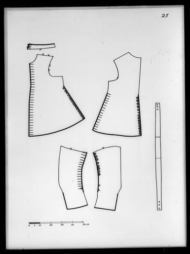 Keywords: Jacka av grå kamlott. Tillhört Karl X Gustav (1622-1660) - Livrustkammaren - 17357.tif LSH artwork sv Denna dräkt består av jacka byxor och kanoner av grå kamlott d'Hollande Materialet är gråbrun yllekamlott med en vådbredd av 77 cm utan stad 20x8 5 tr/cm2 Varpen består av 1ljus och 1 mörk tråd som tvinnats åt höger tillsammans och inslaget består av 3 ljusa otvinnade trådar Staden utgörs av enbart 2 vita trådar <br/>Jackan som till sin form mycket påminner om jackan till dräkt nr 3419 är sydd av 4 storastycken som vidgats i sidorna och rundats i kanten Den har ca 37 cm öppna skört i sidornaoch bak Jackan har sytts ihop med korta sidosömmar och mitt bak endast till midjan Ärmarna består av 2 stycken och har öppna framsömmar Jackan är mitt fram 69 cm lång ståndkragen oräknad denna är 5 cm hög mitt fram och mitt bak 3 5 cm Mitt bak är jackan 73cm lång utan krage Den har sytts så att dess korta sidosömmar sömmen mitt bak ochaxelsömmarna sytts samman från baksidan <br/>Ärmarna har sytts ihop så att överstyckena ligger ovanpå de undre i den utsvängda baksömmenoch ärmarna har sedan trätts genom ärmhålet Endast den lilla korta framsömmen 15 cmlång nedanför det ca 35 cm långa sprundet har sytts ihop från baksidan I baksömmen påärmen är den nedre - raka - delen ca 15 cm lång öppen för att kunna bilda uppslag och harhär försetts med en skoning av brun rips Jackan verkar ej ha haft något mellanfoder men iärmuppslagen sitter papper mellan fodret och tyget Detta utgör styvnad för denursprungliga fastsydda garneringen av silverspets ty täta hål efter stygn visar att mansytt genom pappret det har varit en ca 9 cm bred spetsbesättning Jackan är fodrad medsilvermoiré med en vådbredd av 49 cm utan stad 64x14 tr/cm2 Varp och inslag är av vittotvinnat silke I varje inslag ligger på rätan en silverlan Stad 0 7 cm 6 gröna 6 gula 6 gröna 6 gula 6 gröna trådar samt 1 tjock vit - ripsbindning Mitt i tyget syns en randefter vattringen <br/>Jackans foder är skuret på samma sätt som tyget i övrigt dock har man omedelbart ovanförsidoskörtets öppning satt in 2 horisontella kilar för att göra plagget mindre åtstramande De är något varierande i storlek och placering men ca 1 cm långa Fram har jackan en helobruten rad av knapphål på vänster sida vilket ju icke är fallet med jackan nr 23 Det ärinalles 29 knapphål 3 5 cm långa och sydda med brunt högertvinnat silke över silkestråd 8stygn/cm På höger sida sitter utefter hela kanten 28 st d 2 cm knappar av vilka dockendast de 17 översta kunnat begagnas eftersom fodret täcker de följande På vänsterframstycke finns i sidokanten 15 knappar och på höger framstyckes sidokant 16 st svarandemot de 16 knapphål som sitter i sidostyckena och baksprundet Inte någon knapp i sprundenmitt bak eller i sidorna har kunnat knäppas ty fodret har hela vägen sytts över hålen Baktill finns på vänster stycke endast 13 knappar kvar På vänster ärms överstycke sitterav knappgarneringen endast 8 knappar kvar på höger ärm finns 14 knappar kvar Ärmarnasbakstycken har vardera 16 knapphål Ärmuppslagen har skoning av brun rips på kamlotten <br/>Kragen som är försedd med styvnad av fiskben instoppade i oblekt linnelärft 19x18tr/cm2 i vertikala avsyningar på drygt ½ cm s avstånd har ursprungligen varit fodrad medljus taft på insidan Detta tyg saknas nu nästan helt I jackan sitter axelsömmarna 2 sthängslen av linnelärft 20x17 tr/cm2 klädda med gulvitt siden De är något kortare framåtän bakåt och har 3 tränsade hål i varje ända så att möjlighet att reglera byxorna längdföreligger Jackan är på ärmarna och längs sprunden översållad av trådrester av grått silke även något enstaka prov på blått silke som tyder på en ursprungligen fastsydd garneringrunt kanterna I 1675 och 1691 års inventarier anmärks också att spetsarna sprättats bort isamband med 1675 års kröning original caption decade 1650 woolen Färg grå d1 - dräkt - yttermaterial material ylle - silver d2 - dräkt - foder material silver LRK Karl X Gustav av Sverige Museum Tre Kronor / Ståthållarämbetet - STÄ tidigare Kungl Husgerådskammaren 1999-2015 Modelejon 2002 place of origin original filename LN_A02362_002362 58011 inventory number LRK 21476 17357 CC0 Jacka av grå kamlott Tillhört Karl X Gustav 1622-1660 - Livrustkammaren - 17357-negative tif <gallery caption Different images of same object > File Jacka av grå kamlott Tillhört Karl X Gustav 1622-1660 - Livrustkammaren - 25919 tif File Jacka av grå kamlott Tillhört Karl X Gustav 1622-1660 - Livrustkammaren - 1360 tif File Jacka av grå kamlott Tillhört Karl X Gustav 1622-1660 - Livrustkammaren - 9920 tif File Två dräkter som tillhört Karl X Gustav - Livrustkammaren - 65156 tif File Jacka av grå kamlott Tillhört Karl X Gustav 1622-1660 - Livrustkammaren - 27044 tif File Jacka av grå kamlott Tillhört Karl X Gustav 1622-1660 - Livrustkammaren - 18482 tif </gallery> Jackets Media contributed by LSH 2015-11 |