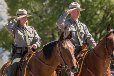View Original:Jackie_Sene_and_Dan_Kowalski,_members_of_Yellowstone's_Color_Guard,_salute_the_flag..jpg (5760x3840)