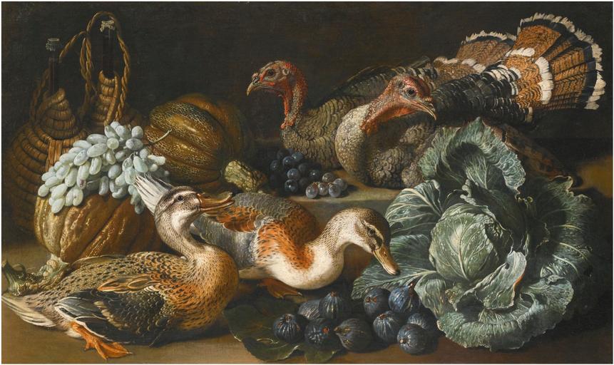Keywords: Jacob van der Kerckhoven - A still life of ducks, turkeys, melons, figs, grapes and a cabbage on a stone ledge.jpg century 17 oil canvas cm 67 5 115 Auctioned at Sotheby's on 6 December 2012 in London lot 183 http //www sothebys com/en/auctions/ecatalogue/2012/old-master-british-paintings-day-sale-l12037/lot 183 html PD-old-100 Works by Jacob van der Kerckhoven Paintings of ducks Still-life paintings of vegetables |