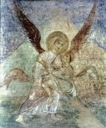 | Keywords: Jacob wrestling with the Archangel - Google Art Project.jpg  commons date commons medium commons dimensions commons institution commons location commons references commons object_history commons exhibition_history commons credit_line commons inscriptions commons notes commons accession_number commons source commons permission commons other_versions commons zoom core title The scene depicts one of the most mysterious bible scenes Jaсob took up the struggle with Somebody who came at night and was fighting with him till the dawn Genesis 32 25-28 In the morning Somebody realizing that he would not defeat Jacob touched Jacob s thigh and started begging to let him go Jacob having understood that he fought with God asked for blessing Jacob received God s blessing together with a new name Israel struggler with God We can see a tense moment of struggle which symbolizes spiritual struggle the winner of which is Jacob blessed by God core creator Unknown core date dateCreated 1000 core type monumental painting fresco google display_date 1000 google is_artproject TRUE google is_gigapixel FALSE google is_secured TRUE google partner/id 000000000804b21e google picasa_token TvRp3H0JoQqgO-TNcDmCpxBZsTg special url_id 3gGYM7H8oj_wog google partner/name St Sophia of Kyiv special partner/name_no_lang St Sophia of Kyiv PD-old-100-1923 Google Art Project works by unknown artist Jacob Wrestling with the Angel Saint Sophia Cathedral frescos |