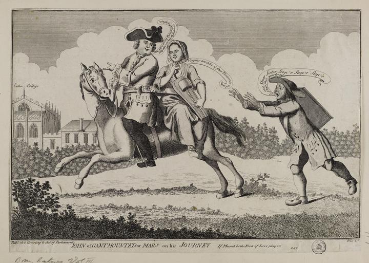 Keywords: Jacobite broadside - John of Gant Mounted or Mars on his Journey If Musick be the Food of Love Play on.jpg 13 3/4x 9 A picture of the Duke of Cumberland and his Savoyard girl on a horse with the brother of the girl calling out after in horror My Dear Sister Stop 'e Stop 'e Stop 'e O I fear she's gine for aye The Duke and the girl are attached by The Girdle of Affection and he says My al is in my possession and she says Virgins are like ye fair flowers in its Lustre Size cm 22 22 exhibition history Institution National Library of Scotland Prints and broadsides object history object type PD-old-70-1923 place of creation Blaikie SNPG 75241535 Jacobite broadside - John of Gant Mounted or Mars on his Journey If Musick be the Food of Love Play on Uploaded with GWToolset Jacobite broadside - John of Gant Mounted or Mars on his Journey If Musick be the Food of Love Play on http //deriv nls uk/56YK98Q/7524/75241537 2 jpg Images uploaded as part of NLS-WMUK collaboration Jacobite broadsides