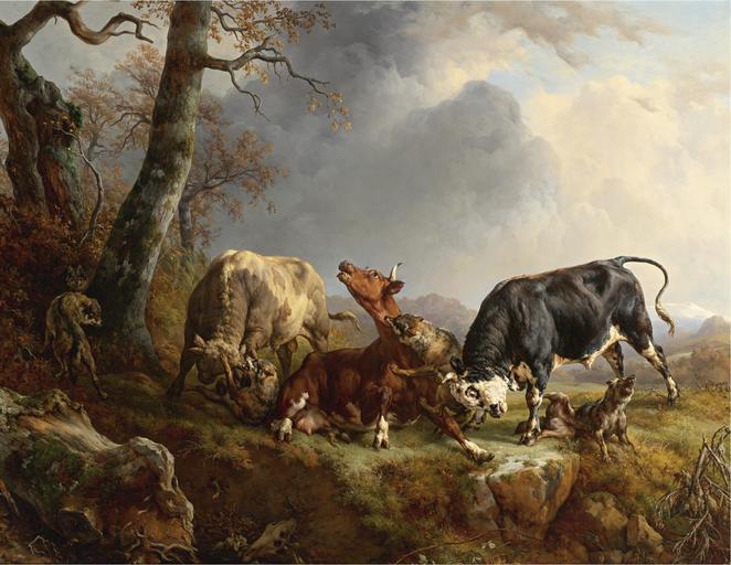| Keywords: Jacques Raymond Brascassat - Deux taureaux défendre contre une vache attaqués par des loups.jpg Artwork Creator Jacques Raymond Brascassat fr Deux taureaux défendent une vache attaquée par des loups 1845 oil canvas cm 152 4 196 2 accession number object history Private collection France credit line R Brascassat 1845 ~ lower center signature and date Landschaftsmalerei http //www sothebys com/en/auctions/ecatalogue/2007/sporting-art-n08369/lot 132 html Sotheby's New York 29 November 2007 lot 132 PD-old-100-1923 Jacques Raymond Brascassat 1845 paintings Paintings of wolves Images from Sotheby's 1840s landscape paintings Fighting animals in art Paintings of cattle |