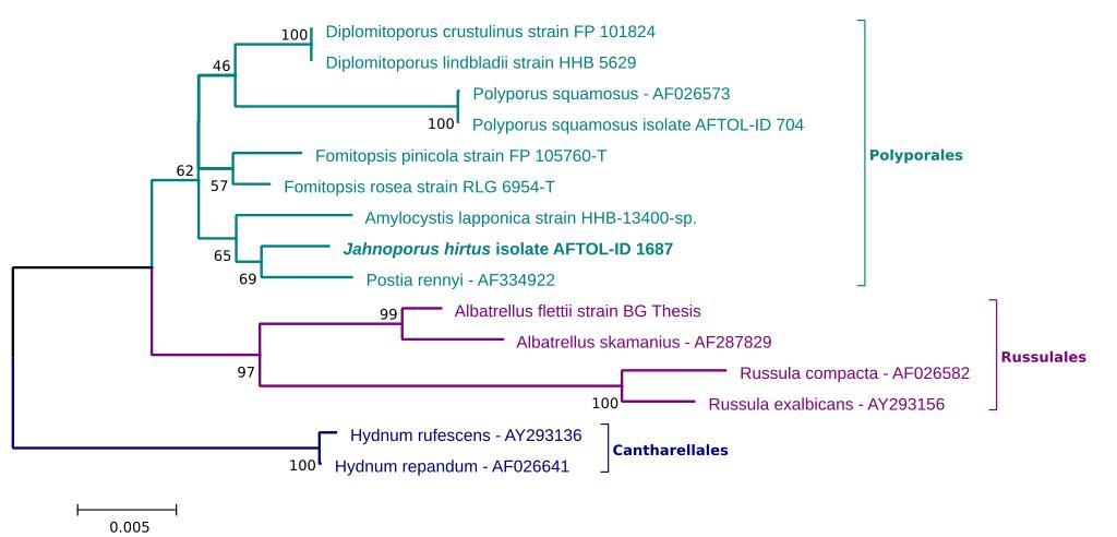 Keywords: Jahnoporus-Minimum Evolution-Tree-2.svg Figure Evolutionary relationships of Jahnoporus <br/> The evolutionary history was inferred using the Minimum Evolution method using the 18S small subunit ribosomal RNA gene The optimal tree with the sum of branch length 0 11347278 is shown The percentage of replicate trees in which the associated taxa clustered together in the bootstrap test 1000 replicates are shown next to the branches The tree is drawn to scale with branch lengths in the same units as those of the evolutionary distances used to infer the phylogenetic tree The evolutionary distances were computed using the Maximum Composite Likelihood method and are in the units of the number of base substitutions per site The ME tree was searched using the Close-Neighbor-Interchange CNI algorithm at a search level of 2 The Neighbor-joining algorithm was used to generate the initial tree The analysis involved 15 nucleotide sequences All ambiguous positions were removed for each sequence pair There were a total of 1138 positions in the final dataset Phylogenetic and molecular evolutionary analyses were conducted using http //www megasoftware net MEGA version 5 Tamura Peterson Peterson Stecher Nei and Kumar 2011 All sequences were obtained from the Genbank and were aligned by the Muscle algorithm with standard settings ; List with GenBank Sequences http //www ncbi nlm nih gov/nuccore/AY336770 Diplomitoporus crustulinus GenBank AY336770 http //www ncbi nlm nih gov/nuccore/AY336768 Diplomitoporus lindbladii GenBank AY336768 http //www ncbi nlm nih gov/nuccore/AF026573 Polyporus squamosus GenBank AF026573 http //www ncbi nlm nih gov/nuccore/AF026573 Polyporus squamosus GenBank AY705963 http //www ncbi nlm nih gov/nuccore/AY336765 Fomitopsis pinicola GenBank AY336765 http //www ncbi nlm nih gov/nuccore/AY336764 Fomitopsis rosea GenBank AY336764 http //www ncbi nlm nih gov/nuccore/AF518570 Amylocystis lapponica GenBank AF518570 http //www ncbi nlm nih gov/nuccore/DQ911607 Jahnoporus hirtus GenBank DQ911607 http //www ncbi nlm nih gov/nuccore/AF334922 Oligoporus rennyi GenBank AF334922 http //www ncbi nlm nih gov/nuccore/AF518569 Albatrellus flettii GenBank AF518569 http //www ncbi nlm nih gov/nuccore/AF287829 Albatrellus skamanius GenBank AF287829 http //www ncbi nlm nih gov/nuccore/AF026582 Russula compacta GenBank AF026582 http //www ncbi nlm nih gov/nuccore/AY293156 Russula exalbicans GenBank AY293156 http //www ncbi nlm nih gov/nuccore/AY293136 Hydnum rufescens GenBank AY293136 http //www ncbi nlm nih gov/nuccore/AF026641 Hydnum repandum GenBank AF026641 own 2013-03-26 Thkgk Cc-zero Jahnoporus |