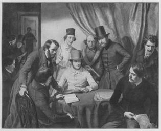 | Keywords: Jahrhundertausstellung 1906 KatNr. 0586.jpg Artwork Creator Günther Gensler Die Mitglieder des Hamburger Künstlervereins 1840 Die braune Inschrift auf dem weißen Zettel v d Link z Recht stehend J H Sander 30 J Georg Haeselich 34 Günther Gensler 27 Herm Soltau 28 C J Milde 37 Herm Kauffmann 32 Rudolf Hardorf 24 Sitzend Otto Speckter 33 Franz Heesche 34 Jacob Gensler 32 Martin Gensler 29 Jahre alt Darunter Günther Gensler pinx Hamburg 1840 Oil Canvas cm 158 186 Der Raum auf dem Gemälde ist der obere große Raum des Baumhauses am Baumwall Hamburg wo zu der Zeit die Mitglieder des Hamburger Künstlervereins sich im Sommer immer sonnabends trafen Kunsthalle Hamburg lt Quelle self scanned from own book Vorstand der Deutschen Jahrhundertausstellung Herausgeber žKatalog zur Ausstellung deutscher Kunst aus der Zeit von 1775 “1875 in der Königlichen Nationalgalerie Berlin Verlag F Bruckmann AG München 1906 2 Bände 1840 PD-art-100 Other versions <gallery>Günther Gensler Die Mitglieder des Hamburger Kunstvereins 1840 jpg</gallery> Günther Gensler Jahrhundertausstellung deutscher Kunst 1906 Johann Jakob Gensler Martin Gensler Otto Speckter Hermann Kauffmann Johann Georg Haeselich Hamburger Künstlerverein von 1832 Johann Heinrich Sander Carl Julius Milde Baumhaus Hamburg Franz Heesche Group portraits of painters Portraits of Hermann Wilhelm Soltau ImageNote 1 24 24 1755 1424 1806 1468 2 Stumpfrote Tischdecke hellgraue Wand dunkelgoldgelber Vorhang Die Fleischtöne rosa und braun Das hellste Kostüm des in der Mitte Sitzenden ein durch warmes Braun gemildertes Weißgelb Der Hut in gebräuntem Grau Der links hinter ihm Stehende mit bleichem Gesicht und dunkelrotem Fez; auf dem weißen Hemd eine hellblaue Krawatte hellila Jacke Der rechts von dem Sitzenden in rosaviolettem Rock mit grauem Pelzbesatz Die anderen Kostüme in dunklen braunen grünen und schwarzen Tönen “ Die braune Inschrift auf dem weißen Zettel v d Link z Recht stehend J H Sander 30 J Georg Haeselich 34 Günther Gensler 27 Herm Soltau 28 C J Milde 37 Herm Kauffmann 32 Rudolf Hardorf 24 Sitzend Otto Speckter 33 Franz Heesche 34 Jacob Gensler 32 Martin Gensler 29 Jahre alt Darunter Günther Gensler pinx Hamburg 1840 ImageNoteEnd 1 |