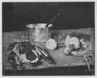 | Keywords: Jahrhundertausstellung 1906 KatNr. 1596.jpg Artwork Creator Carl Schuch Kasserole und Wildente Oil Canvas cm 64 5 81 Kunsthalle Hamburg lt Quelle Vorstand der Deutschen Jahrhundertausstellung Herausgeber žKatalog zur Ausstellung deutscher Kunst aus der Zeit von 1775 “1875 in der Königlichen Nationalgalerie Berlin Verlag F Bruckmann AG München 1906 2 Bände ; self scanned from own book PD-old-70-1923 Other versions Still life paintings by Carl Schuch Jahrhundertausstellung deutscher Kunst 1906 ImageNote 1 26 34 1414 1124 1469 1183 2 er Tisch Braun auf Grau Die Ente schwarzweiß mit grauen und braungrauen à bergängen Dieselbe Kombination kehrt gemildert ohne das Schwarz in der Kasserole wieder Die Knollen des Gemüses Braungelb auf Weißgelb mit blutroten und lilaroten Stellen Die Stengel reiche Nuancen von Grün die durch gelbe Striche erhellt sind Braunschwarzer Grund “ Bez unten rechts hellgrau Ch Schuch ImageNoteEnd 1 |