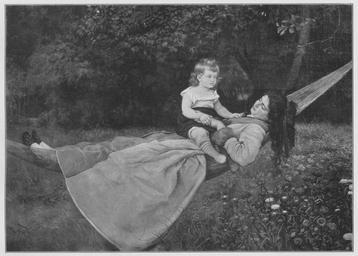 | Keywords: Jahrhundertausstellung 1906 KatNr. 1763.jpg Artwork Creator Hans Thoma Des Künstlers Frau mit einem Kinde in der Hängematte Oil Canvas auf Holz cm 109 148 Professor Dr H Thoma Karlsruhe i B lt Quelle Vorstand der Deutschen Jahrhundertausstellung Herausgeber žKatalog zur Ausstellung deutscher Kunst aus der Zeit von 1775 “1875 in der Königlichen Nationalgalerie Berlin Verlag F Bruckmann AG München 1906 2 Bände ; self scanned from own book 1876 PD-old-70-1923 Other versions Hans Thoma in Jahrhundertausstellung deutscher Kunst 1906 Jahrhundertausstellung deutscher Kunst 1906 ImageNote 1 25 20 1953 1389 2003 1434 2 Helles Grün auf gelbgrünem Grund Rechts dunkelblaue und rote Astern Hintergrund dunkleres Grün Die Hängematte und das Kleid in zwei Tönen von Grau in denen Spuren von Hellbraun mitsprechen Das Kind in bläulichgegrautem Hemd und tief blutrotem Rock “ Bez unten links Monogramm H T 76 Thoma-Werk Bd V Nr 325 ImageNoteEnd 1 |