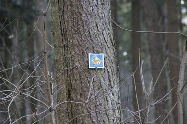 Keywords: jakobsweg scallop directory shield trail pilgrimage pilgrims path hiking hike make a pilgrimage forest log nature rest