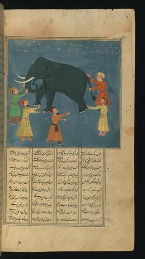 | Keywords: Jalal al-Din Rumi, Maulana - Townspeople, Who have Never Seen an Elephant, Examine its Appearance in the Dark - Walters W626117B - Full Page.jpg On this folio from Walters manuscript W 626 townspeople who have never seen an elephant examine its appearance in the dark islamic 1663 1073 ink and pigments on thin laid paper probably Kashmiri cm 26 5 15 accession number W 626 117B 83750 Ibrahim date and mode of acquisition unknown round seal impression Ibrahim on front flyleaf iia Henry Walters Baltimore date and mode of acquisition unknown Walters Art Museum Henry Walters Acquired by Henry Walters place of origin Bharat Walters Art Museum license 2D Manuscript by Rumi Walters MS 626 Media contributed by the Walters Art Museum needs category review |