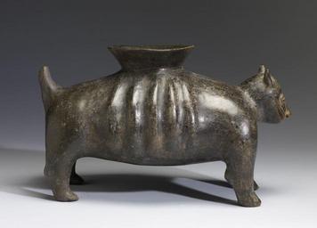 Keywords: Jalisco - Dog Effigy Vessel - Walters 20092023 - Right Side.jpg Dogs were indigenous to the ancient Americas the Mexican Hairless being the likely model for the West Mexico effigies Throughout Mesoamerica they served as companions hunting partners underworld guides and even sources of food Ceramic portrayals of dogs are particularly numerous in the shaft tombs of West Mexico placed among the burials' myriad human pottery figures and dishes of food for the journey after death Most dogs are depicted as plump and docile As tomb offerings these fattened versions may have symbolized food for the deceased's arduous underworld voyage The black-slipped canine deftly combines a jar form the most important vessel in the Mesoamerican household with an appealing rendering of a smiling dog In this example the dog's ribs recall the flutes of a gourd the ageless and most common food-service vessel throughout the ancient Americas Considered as a whole this vessel-sculpture's multiple references to food suggest that it too alludes to dogs as sustenance 300 BC-AD 200 Archaic burnished earthenware H 8 3/16 x L 13 15/16 x W 7 1/2 in 20 8 x 35 4 x 19 cm accession number 2009 20 23 80178 Ron Messick Fine Arts Santa Fe New Mexico date and mode of acquisition unknown John G Bourne 1990s by purchase Walters Art Museum Gift of John Bourne 2009 place of origin Jalisco Mexico Walters Art Museum license Pottery from ancient Jalisco in the Walters Art Museum Dogs in Pre-Columbian art