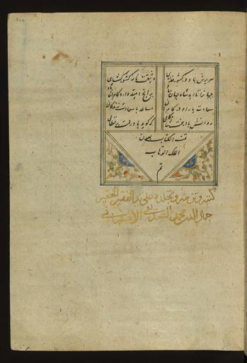 Keywords: Jamal al-Din Muhammad al-Siddiqi al-Isfahani - Colophon - Walters W605314A - Full Page.jpg This folio from Walters manuscript W 605 contains the 4th of 5 colophons in Arabic giving the names of the scribe illuminator and bookbinder This colophon is written in gold Tawqi' script below the frame and reads katabahu wa-tazayyanahu wa-tajalladahu 'alá yad al-faqir al-haqir Jamal al-Din Muhammad ak-Siddiqi al-Isfahani 892 AH/AD 1486-900 AH/AD 1494-1495 Safavid ink pigments laid paper cm 23 16 accession number W 605 314A 83589 Henry Walters Baltimore date and mode of acquisition unknown Walters Art Museum Henry Walters Acquired by Henry Walters Transliteration place of origin Iran Walters Art Museum license 2D Khamsa of Nizami Safavid Walters MS 605 Media contributed by the Walters Art Museum needs category review |