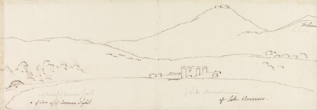 Keywords: James Barry - The Cave of the Cumean Sybil on the Shore of the Lake Avernus - Google Art Project.jpg Inscribed in artist's hand in pen and brown ink upper right Falern ; in graphite upper right Falern ; in graphite lower left o ye Cave of ye Cumean Sybil ; in pen and brown ink lower left o ye Cave of ye Cumean Sybil ; in graphite lower right ye lake Avernus - ; in pen and brown ink lower right ye lake Avernus ; inscribed on back in graphite lower right Inscription _Marks Watermark coat-of-arms Churchill 262 Inscription _Signed_and_Dated not signed Not on View Pen and brown ink and graphite on medium slightly textured cream laid paper Grand Tour caves lakes hills shores landscape special url_id RwHCyScpOAvbgQ PD-old-100-1923 1806 James Barry Google Art Project works by James Barry Collections of the Yale Center for British Art |