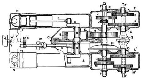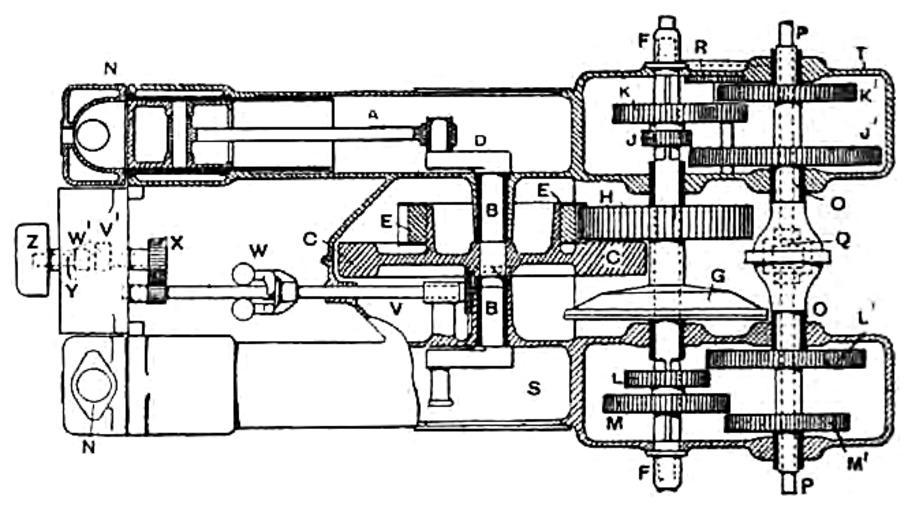 Keywords: James and Browne gearbox.png Engine and gearbox of a James and Browne automobile circa 1902 sectioned horizontally to show mechanical layout I'll attempt to provide a key below The Automobile A Practical Treatise by Paul Nooncree Hasluck through Google Books http //books google com/books id vgdJAAAAMAAJ 1903 book Paul Nooncree Hasluck 1854-1931 PD in all life+70 nations A Connecting rod B Crank shaft C Flywheel D Overhang cranks parallel with one another E Buffoline spur wheel i e rawhide F First-motion shaft G Clutch H Spur wheel J First speed gears K Third speed gears L Second speed gears M Fourth speed gears N Cylinders combustion chamber O Sleeve of countershaft P Countershaft Q Differential casing and brake drum R Reversing intermediate spur S Crank chamber T Composite aluminium crank-case U Bevel gears driving cams V Intermediate camshaft W Motor governor X Spur gearing Y Camshaft Z Commutator PD-old James and Browne vehicles Automobile transmissions