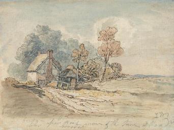 | Keywords: James Ward - A Thatched Cottage and Trees at the Turn of a Country Road - Google Art Project.jpg Inscribed in graphite lower right JW ; lower left Hovel very dark light on roof bridg - clear upon Rail more of the turn of Road broader Inscription _Signed_and_Dated Signed in graphite lower right JW Not on View Brown ink and watercolor over graphite on medium slightly textured cream laid paper thatched chimney cottage trees road landscape special url_id fQFtNYjMmSsfpA PD-old-100-1923 1859 James Ward Google Art Project works by James Ward |