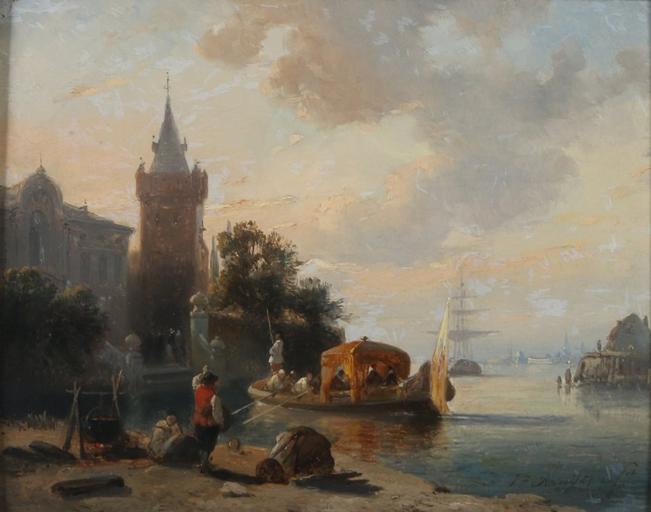 | Keywords: Jan Michiel Ruyten - View on a harbour with a gondola.jpeg Artwork Creator Jan Michiel Ruyten 1833 - 1881 Oil on canvas size cm 17 22 accession number object history credit line signed lower right Auctioned at Vendu Notarishuis KV-245 November 2015 Lot 29 https //www notarishuis com/Catalogus/Index/1 page 2 PD-old-100 Jan Michiel Ruyten Paintings of rivers Oil paintings of ports and harbours | ||||