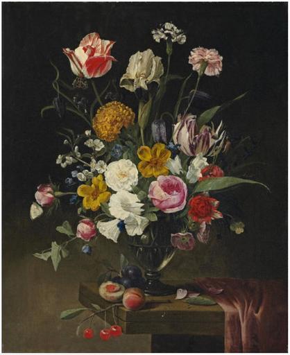 | Keywords: Jan Philip van Thielen - Roses, tulips, carnations and an iris in a glass vase on a draped stone ledge.jpg Artwork Creator Jan Philips van Thielen title Roses tulips carnations and an iris in a glass vase on a draped stone ledge 17th century http //www christies com/LotFinder/lot_details aspx intObjectID 5022060 oil canvas cm 73 59 Sold at Christie's on 7 December 2007 in London lot 128 The fruit on the ledge may have been executed by a different hand within the 17th century PD-old-100 indistinctly signed 'I P ' lower centre on the ledge Other versions Jan Philip van Thielen Bouquets in art 17th-century oil on canvas paintings 17th-century still life paintings of flowers in glass vases |