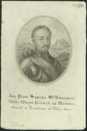 | Keywords: Jan Piotar Sapieha. Ян Пётар Сапега (D. Weiss, 1819).jpg Яна Пят а Сапегі Jan Piotar Sapieha ге бу «Ліс» 1569 1611 вайсковага дзеяча Вялікага Княства Літоўскага удзельніка інтэ вэнцыі Рэчы Паспалітай у аскоўскую дзя жаву 1819 copper engraving cm 22 14 5 Institution National Library Warsaw accession number G 10438/III Niemcewicz J U Dzieje panowania Zygmunta III króla polskiego T 2 Warszawa 1819 Tabl m s 424/425 See below <gallery> Jan Piotar Sapieha Ян Пёта Сапега D Weiss 1819 jpg Jan Piotar Sapieha Ян Пёта Сапега D Weiss 1819 jpg </gallery> PD-old-100 Jan Piotr Sapieha Engravings in the National Library in Warsaw Collection of Dmitriy Rovinsky |