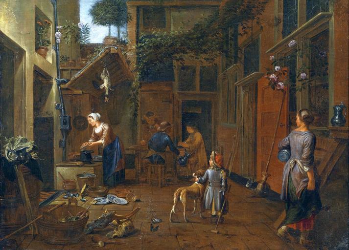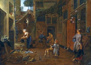 | Keywords: Jan van Buken Innenhof mit Küche.jpg Artwork creator Jan van Buken en Lively courtyard of a house de Im belebten Innenhof eines Gebäudes I Van Buken Fec signature lower right oil on canvas cm 45 61 http //www dorotheum com by 1694 object history credit line accession number PD-old-100 Jan van Buken 17th-century way of life in painting Paintings of kitchens People with dogs in art 1694 paintings 17th-century oil on canvas paintings 17th-century paintings location missing Flemish villages in genre paintings Paintings of courtyards and patios Images from Dorotheum |