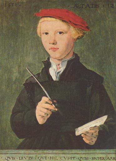 Keywords: Jan van Scorel 004.jpg attributed to LangSwitch or ou of attributed to 1531 Oil on panel cm 46 5 35 Institution Museum Boijmans Van Beuningen 06 accession number 1797 OK object history by 1864 J van der Hoop between 1864-10-13 1864-10-14 anonymous sale Rotterdam Boijmans Rotterdam exhibition history Jeroen Bosch Noord-Nederlandsche primitieven 51 110 132 Jan van Scorel Het portret in de oude Nederlanden 71 Jan van Scorel 52 39 Jan van Scorel Kunst voor de beeldenstorm 194-195 72 Maarten van Heemskerck Maarten van Heemskerck credit line 1531 · top left date ~ · AETATIS · 12 top right age of model la at the age of 12 à l'âge de 12 ans · QVIS · DIVES · QVI · NIL · CVPIT · PAVPER · AVAR full form Quis dives qui nil cupit pauper avarus bottom la He who does not desire anything is rich the miser is poor Qui ne désire rien est riche l'avare est pauvre LangSwitch On the note in mirror writing sur le papier écriture en miroir Op het briefje in spiegelschrift bottom right 1797 OK Jan van Scorel LangSwitch Portrait of a young scholar Portret van een jonge scholier cm 46 5 35 5386 Attributed to Jan van Scorel / Maarten van Heemskerck Portret van een twaalfjarige scholier cm 46 6 35 40005817 Attributed to Jan van Scorel / Maarten van Heemskerck Portret van een twaalfjarige scholier cm 46 6 35 http //www wga hu/html/s/scorel/port_sch html Jan van Scorel Portrait of a Schoolboy Size cm 47 35 The Yorck Project 10 000 Meisterwerke der Malerei DVD-ROM 2002 ISBN 3936122202 Distributed by DIRECTMEDIA Publishing GmbH http //mail wikipedia org/pipermail/wikide-l/2005-April/012195 html Jan van Scorel - Portrait of a Young Scholar - Google Art Project jpg Version from www googleartproject com Jan van Scorel - Portrait of a Schoolboy - WGA21085 jpg Version from www wga hu place of creation Utrecht i18n/or Haarlem PD-old-100 PD-Art-YorckProject Portraits from Norbert Schneider The Art of the Portrait 107 Paintings by Jan van Scorel Attributed Maarten van Heemskerck Attributed Dutch Renaissance paintings in the Museum Boijmans Van Beuningen Scorel Jan van Museum Boijmans Van Beuningen - Room 06 Scorel 1530s paintings in the Netherlands 1531 portrait paintings Male 16th-century oil on panel paintings in the Netherlands 16th-century oil portraits of boys at half length 1531 16th-century portrait paintings in the Netherlands 1531 Berets in art Blond hair in art Boys looking at viewer in art Paintings with years of production artist People with berets Portrait paintings with green background 1531 Portraits with Latin captions Portraits with parapet 1531 Portraits writing Red headwear in art Renaissance portraits of boys Schools in art