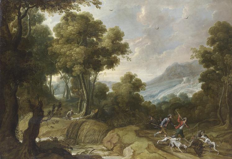 Keywords: Jan Wildens and Cornelis de Wael - A forest landscape with hunters and their dogs attacking a wolf.jpeg Artwork Creator Jan Wildens Creator Cornelis de Wael en A forest landscape with hunters and their dogs attacking a wolf 1602-1653 https //www bonhams com/auctions/14305/lot/72/ oil canvas Size cm 169 117 object history exhibition history credit line Indistinctly signed `JAN WIL ` lower left Sold at Bonhams on 5 July 2006 in London lot 72<br> The landscape painted by Jan Wildens and the figures by Cornelis de Wael Source https //rkd nl/explore/images/52109 RKD accession number place of creation PD-old-100 Cornelis de Wael Jan Wildens Paintings by two artists Paintings of wolf hunting Images from Bonhams |