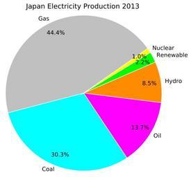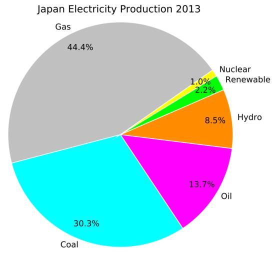 | Keywords: Japan Electricity Production 2013.svg en This pie graph shows Japan's energy production in 2013 by percent of national production Data is drawn from a 2014 report by the Ministry of Economy Trade Industry http //www enecho meti go jp/about/pamphlet/pdf/energy_in_japan2014 pdf 日 のエネルギー2014 The Ministry of Economy Trade Industry sometimes divides oil-derived fuels and natural gas in different ways so if you see other numbers for 2013 that differ only in those categories it's not a mistake in the numbers it's a slightly different categorization 2015-12-01 own Douglas Perkins other versions cc-zero Energy in Japan Uploaded with UploadWizard |