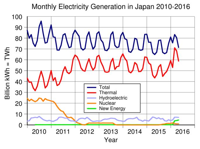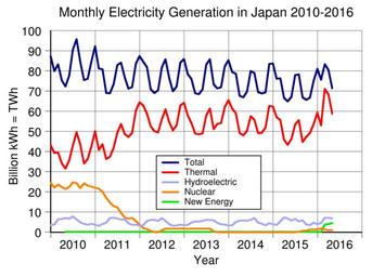 | Keywords: Japan monthly electric generation.svg translate yes en Japan monthly electricity generation New energy or renewable is wind solar and geothermal Source is Japan's http //www fepc or jp/library/data/hatsujuden/index html FEPC http //www fepc or jp/english/news/generated_purchased/ English https //www iea org/statistics/monthlystatistics/monthlyelectricitystatistics/ IEA own Delphi234 2016-05-22 current monthly Generated with Wikimedia SVG Chart 1 s Cc-zero Electricity in Japan | ||||